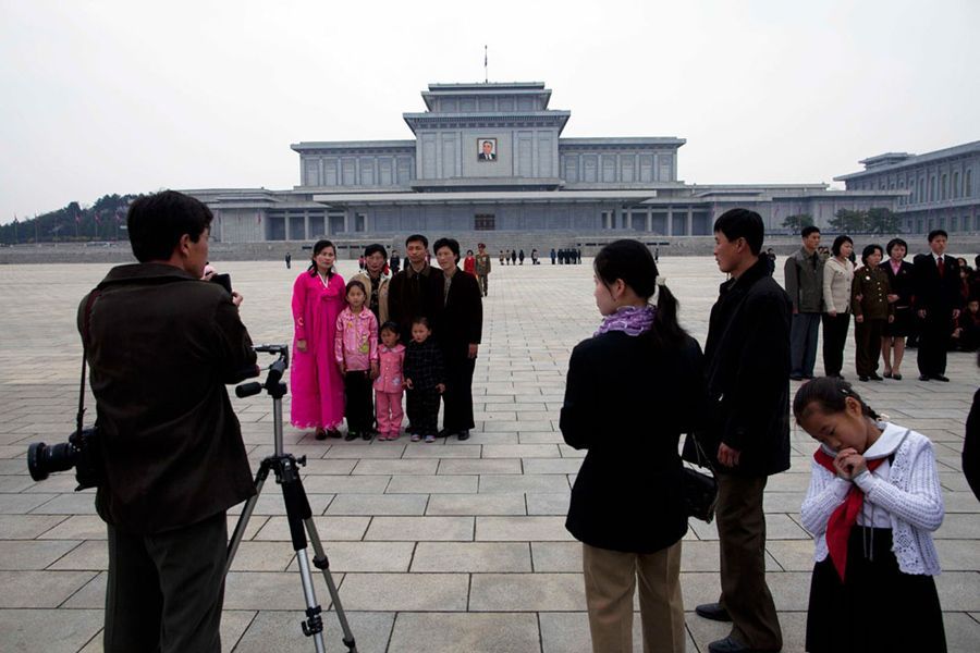 4월 15일 평양 금수산 기념관, 가족들이 기념관 앞에서 사진 촬영을 하고 있다.
