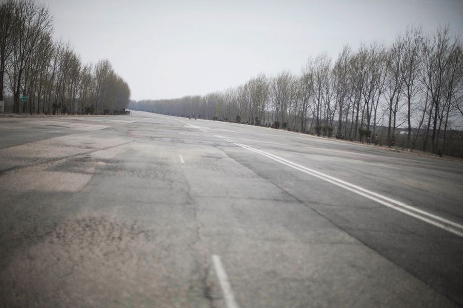 4월 21일 평양 부근의 대로, 차가 별로 없다.