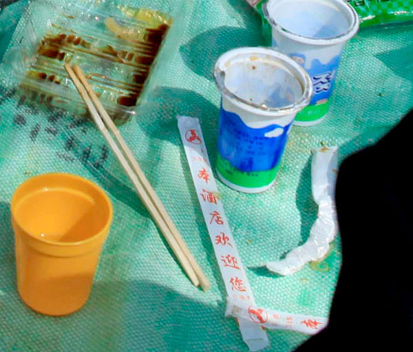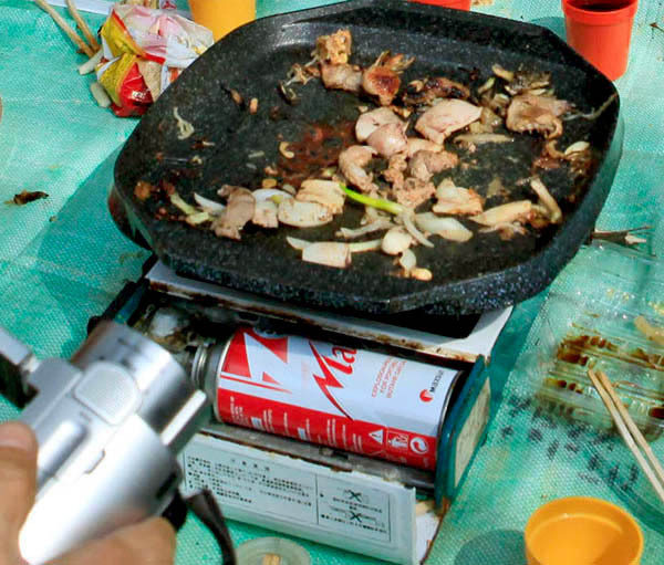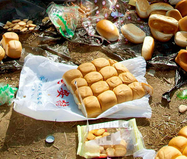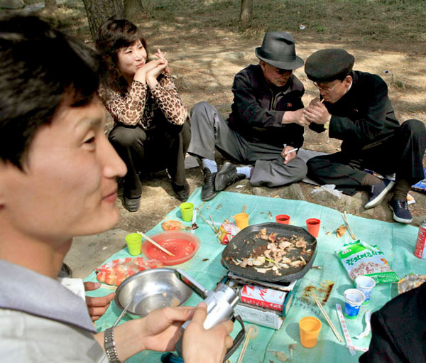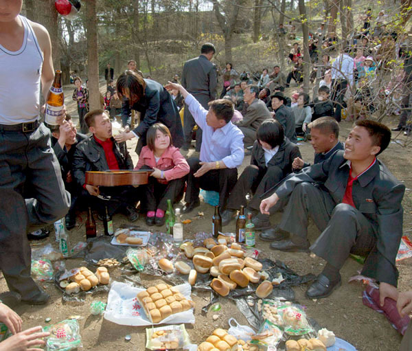 인근 산에서는 행락객들의 잔치가 벌어졌다. 삼삼오오 야유회를 나온 이들은 저마다 술과 먹거리를 즐겼다. 기타를 치고 맥주를 마시며 봄을 즐기고 있다. 우리나라의 1960년대와 70년대 야유회를 연상케 한다. 날씨가 무더웠는지 한 남성은 민소매 티셔츠를 입고 있었다. 북한산 봉학맥주와 소주를 마시고 있다. 나무젓가락 포장지와 빵 봉지엔 한문이 적혀 있어 중국산으로 보인다. 우리의 감자칩과 비슷한 북한산 '감자매운튀김' 포장지도 눈에 띈다. 일회용 부탄가스도 중국산으로 보인다.