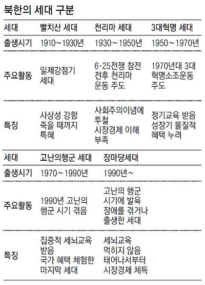 부모들이 장마당에서 장사하는 것을 보고 자라난 이들 ‘장마당세대’는 개인주의가 강하고 어느 세대보다 황금만능주의도 팽배하다. 또 교육 시스템이 붕괴된 이후에 성장했기 때문에 조직생활에도 익숙하지 않다.