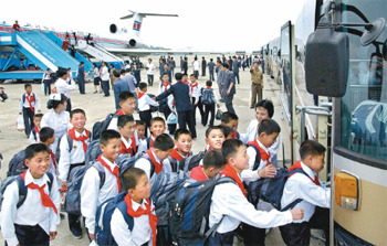 “비행기 타고 왔습니다” 조선소년단 창립 66주년 기념행사에 참가할 함경북도, 양강도, 나선시의 학생 대표들이 지난달 30일 고려항공 여객기로 평양 순안공항에 도착해 버스에 올라타고 있다. 학생들을 ‘나라의 왕’으로 여긴다고 선전하기 위해 여객기까지 동원한 것으로 보인다. 3일부터 8일까지 전국 2만 명의 학생을 초청해 평양에서 열리는 이번 행사는 소년단 행사로는 최대 규모이다. 평양=조선중앙통신 연합뉴스