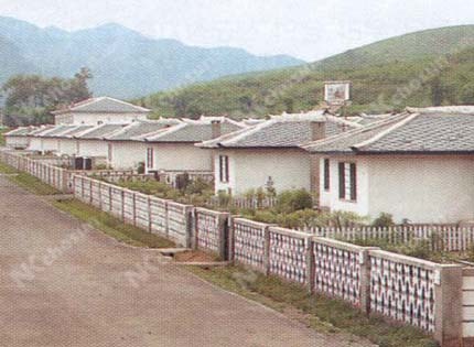 평안남도 맹산군에 건설된 주택의 모습. 북한 화보집『조선』은 위 사진을 "자연지리적 특성에 어울리게 건설된 주택들"이라며 소개하고 있다(1995. 2, p.21).