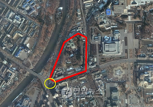 사진은 2006년 12월 재개발 전의 만수대거리 위성사진. 붉은 선 안쪽은 김일성 주석의 옛관저이자 김정일 국방위원장이 유년,청소년기를 보낸 '5호댁 관저'로 이번 만수대거리 재개발 지역에 포함되었다.