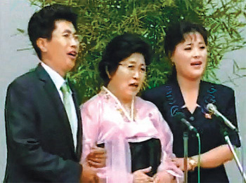 박인숙 씨(가운데)가 지난달 28일 평양에서 기자회견을 하는 도중에 아들 며느리와 함께 김정은의 은혜를 칭송하는 노래를 부르고 있다. 조선중앙TV 화면 촬영