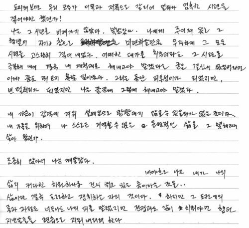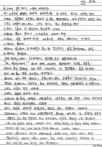 朴씨가 서울에서 쓴 일기 박인숙 씨가 서울에서 남긴 일기의 한 대목. 자신이 걸어온 삶에 대해 스스로 평가하고 있다. 빈 부분은 민감한 내용으로 박 씨를 위해 지웠다.