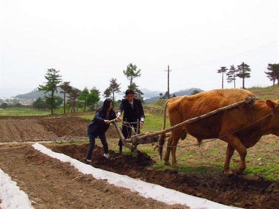 ▲ 문호영 안내원의 도움을 받아 소쟁기를 끄는 필자