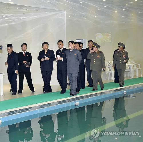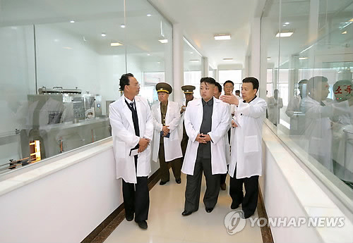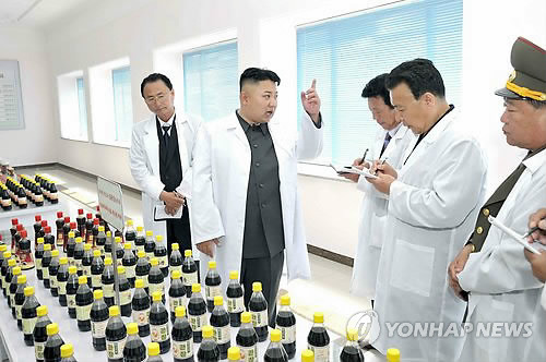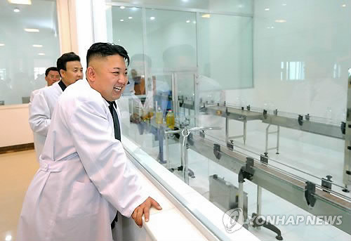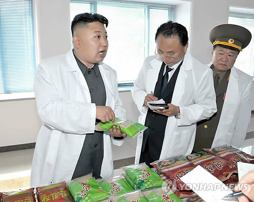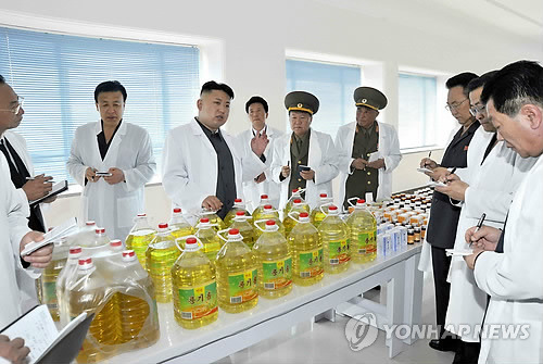 (평양 조선중앙통신=연합뉴스) 북한 김정은 국방위원회 제1위원장이 최근 리모델링을 마친 평양 기초식품공장을 현지지도했다고 조선중앙통신이 8일 전했다.김정은 제1위원장은 먼저 공장탁아소와 공장 문화회관, 종합지령실, 정제기름·미원·정제소금·비타민E 생산공정, 포장공정 등을 둘러보고 전반적 생산공정의 자동화, 무인화를 잘 실현했다고 치하했다.사진 왼쪽은 최룡해 군 총정치국장. 2013.6.8photo@yna.co.kr