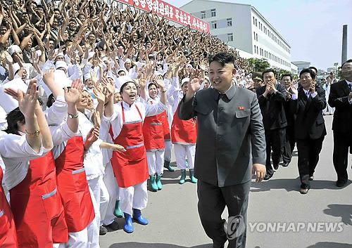 (평양 조선중앙통신=연합뉴스)북한 김정은 국방위원회 제1위원장이 최근 리모델링을 마친 평양 기초식품공장을 현지지도했다고 조선중앙통신이 8일 전했다.김정은 제1위원장이 공장탁아소를 둘러보고 있다.사진 김정은 제1위원장 오른쪽으로 최룡해 군 총정치국장, 문경덕 평양시당 책임비서. 2013.6.8photo@yna.co.kr