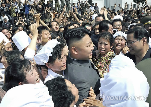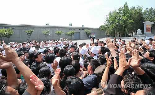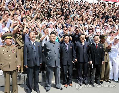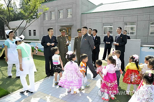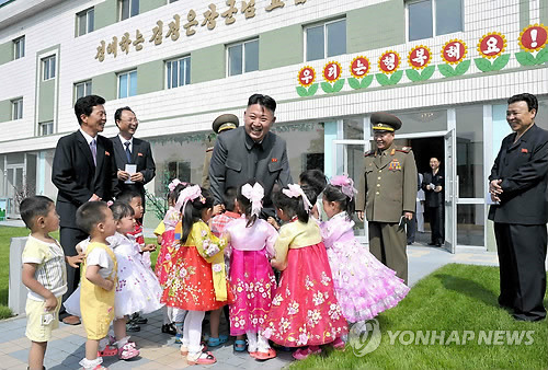(평양 조선중앙통신=연합뉴스) 북한 김정은 국방위원회 제1위원장이 최근 리모델링을 마친 평양 기초식품공장을 현지지도했다고 조선중앙통신이 8일 전했다.김정은 제1위원장이 공장탁아소에서 어린이들에게 둘러싸여 있다.사진 김정은 제1위원장 오른쪽으로 최룡해 군 총정치국장, 문경덕 평양시당 책임비서. 2013.6.8photo@yna.co.kr