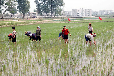 | ▲ 과학농사 시범단위로 지정된 평안남도 문덕군 립석협동농장 농민들이 분조단위로 모내기를 하고 있다. [자료사진 - 민족21] | ||