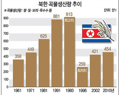 그러나 지난해 9월 가뭄과 집중호우, 태풍 등으로 북한의 곡물생산량이 예년보다 60만톤 가량 줄어들 것이란 예상이 많았다는 점에서 2011년보다 곡물생산량이 5%이상 증가한 것은 농업기반이 상당히 회복됐다는 것을 의미한다.
