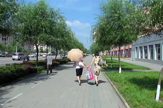 ▲ 모란상점을 들른 신은미 씨 일행이 김설경 씨 집으로 향하고 있다. 사진 속 평양 시가지가 변모한 모습을 볼 수 있다. 특히 잔디심기는 북녘 전 도시로 확산되고 있다. [사진제공-신은미]