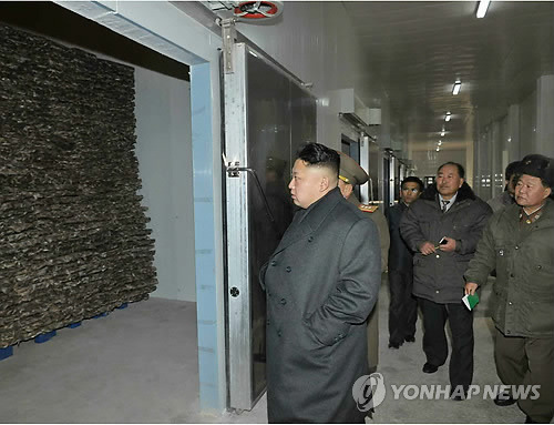 ↑ 北 김정은, 새로 건설된 軍수산물냉동시설 시찰 (서울=연합뉴스) 북한 김정은 국방위원회 제1위원장이 제534군부대가 새로 건설한 수산물냉동시설을 시찰했다고 노동신문이 7일 보도했다. 2014.1.7 <<노동신문.북한부기사참조>> nkphoto@yna.co.kr