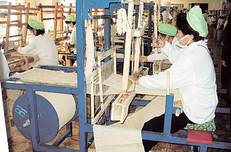 △ 대마에서 섬유를 뽑아내고 있는 북한 여성 근로자들. 이들의 손재주는 호평을 받고 있다.