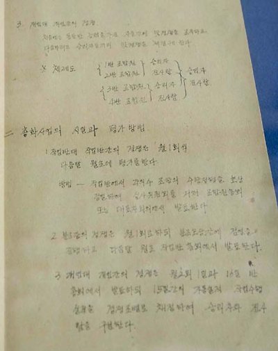 | |  | | | ▲ 1960년 청산리협동농장이 작성한 작업반과 분조의 경쟁 및 평가체계에 대한 내용. [자료사진 - 민족21] |