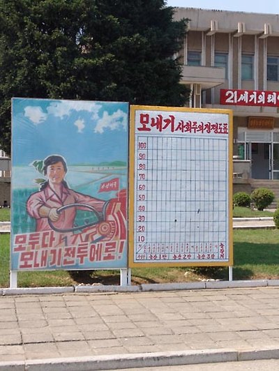 | |  | | | ▲ 평양 칠골농장에 있는 ‘모내기 사회주의경쟁도표’. 이 농장에는 주로 곡물생산을 하는 3개의 농산작업반(각 53~56명으로 구성)이 있고, 그 산하에 각각 4개의 분조가 조직돼 있다는 것을 알 수 있다. 평양시민들에게 남새(야채)를 제공하는 칠골농장에는 8개의 남새작업반(각 32~56명으로 구성)이 조직돼 있고, 이외에 3개의 농산작업반, 1개의 과수작업반(32명), 1개의 축산작업반(12명), 1개의 기계작업반(14명) 등이 설치돼 있다. [자료사진 - 민족21] |