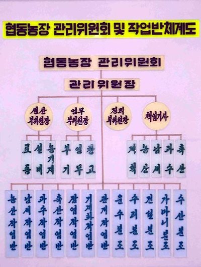 | |  | | | ▲ 북한의 협동농장 운영은 초기의 작업반 중심에서 분조 중심으로 변화됐고, 김정일시대에 들어와서는 분조 산하에 포전담당제를 도입해 작업단위를 더 축소하고 있다. 사진은 남포특급시 강서군에 있는 청산리협동농장의 조직도. 이 조직도에는 표시돼 있지 않지만 각 작업반 밑에서는 분조가 조직돼 있다. [자료사진 - 민족21] |