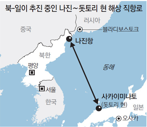1일 복수의 대북 소식통에 따르면 북한의 대외개방 창구인 나진항과 일본 돗토리 현 사카이미나토(境港) 시를 해상으로 잇는 방안이 논의되고 있다. 옌볜(延邊)조선족자치주의 한 제3국 소식통은 “나진 측과 이야기를 진행하고 있다”며 “(높은 수준의 합의가) 됐으면 좋겠다”고 전했다.