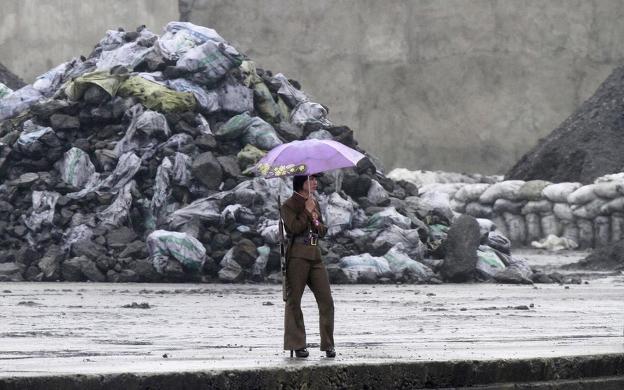 저 위 압록강 근처에서 보초서는 여군이 가진 물건은