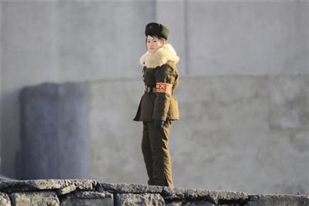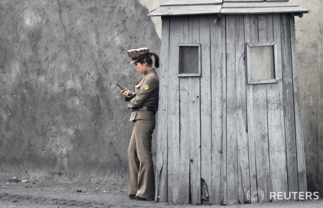 1일 북한 신의주 인근 압록강 강둑에서 보초를 서는 한 여군이 휴대폰을 보고 있다.