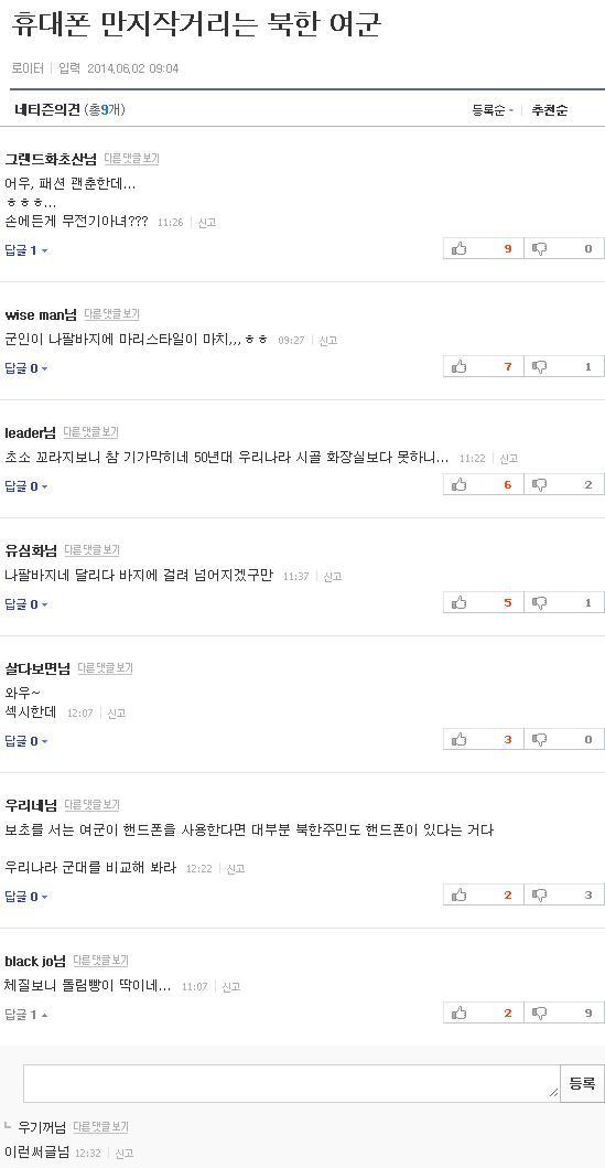 작성자돌머리 작성시간 14.06.02 아마도 세계에서 여군비율이 젤많은곳 치자면 이스라엘과 북일것이다. 그중에서도 북측이 여군이 젤 많은거같다. 북은 누가 군인이고 누가 민간인인지 구분이안된다. 옷만 쏵 바꿔입으면...여자들이 기를쓰고 탈북하는것도 무관하지 않은듯..