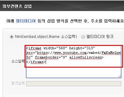 위와 같이 복사해온 동영상 소스코드를 붙여넣기 해주기만 하면 됩니다.