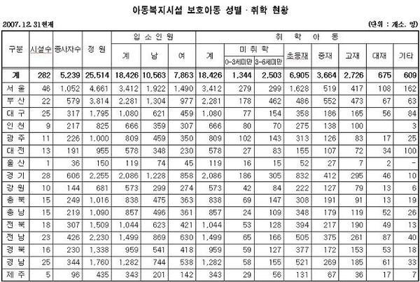 2007년도 아동복지시설에서 생활하고 있는 아이들의 성별 및 연령대를 살펴보면 총 18,426명으로 그 중 남자가 10,563명 여자가 7,863명이었다. 전체인원 18,426명 중 미취학 아동이 3,847명,초등학생이 6,005명, 중학생이 3,664명, 고등학생이 2,726명으로 초등학생의 비율이 가장 높았으며 중학생과 미취학 아동들의 비율은 비슷함을 볼 수있었다. 전체 시설수와 생활 아동수를 비교해보면 서울이나 부산처럼 대도시의 경우 시설당 생활 아동의 수가 1000명에 달하는 것을 볼수 있었다.