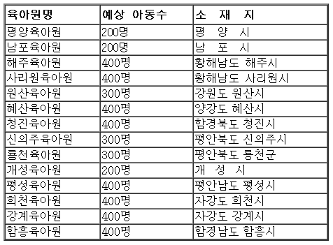 - 육아원은 만4세 미만의 고아들을 양육하는 기관이며, 전국 12개 시도에 14개가 있으며, 보건성에서 관할하고 있다.