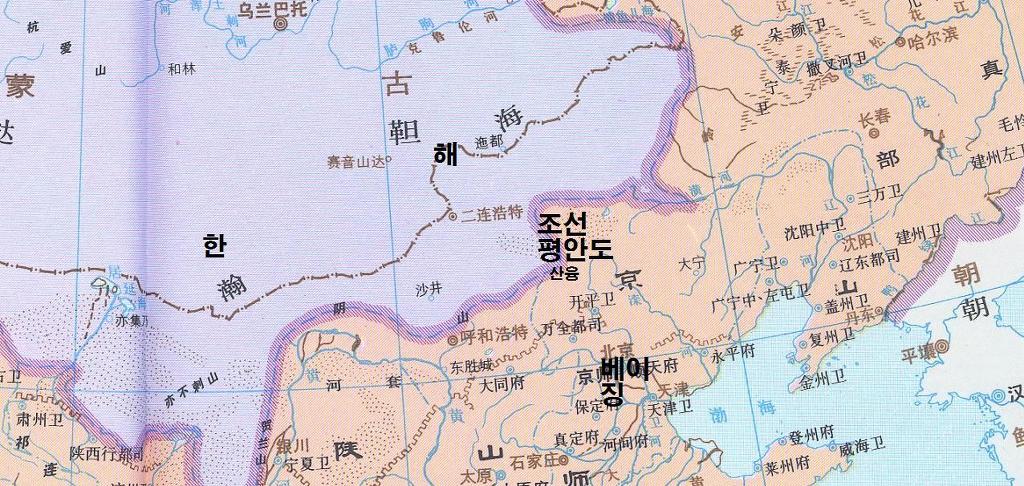 실제로 조선의 지리지 평안도 편에 만리장성 동쪽줄기가 있다고 했다. 즉 지금 만리장성일대가 조선에서는 평안도관할이었던 것이다. 위지도는 조선세조때 작성된 동국지도이다. 분명히 흑수말갈과 거란(요나라)의 땅이 조선땅이라고 기록되어 있다 심지어 고구려의 최전방요새였던 백암성도 조선땅이라고 되어있다. 지금 국사책을 편찬하고 가르치는 서울대를 위시한 국사교수들이 얼마나 엉터리이고 무식한지 위의 지도한장만 봐도 알수 있다. 그놈들 상당수가 우리가 낸 세금으로 봉급받고 있다 어서 내 세금을 돌려주기 바란다. 태종이 점령한 산융의 위치가 베이징동쪽이 아니라 베이징서쪽 장성일대임은 중국에서 편찬한 중국역사지도 명나라편을 보면 알수 있다. 분명히 그들은 베이징을 사이에 두고 두 장성이 명나라때 서로 연결되어 있지 않다고 그렸다. 즉 명나라고지도인 십오국풍지리지도에 나온 산융의 위치는 베이징서쪽 장성의 북쪽일대이다.