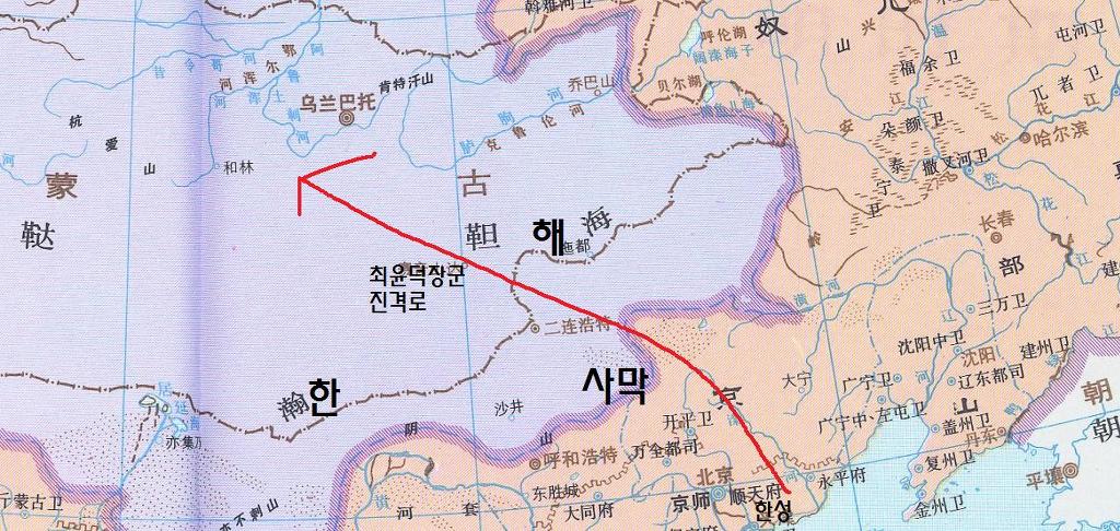 조선왕조실록에 최윤덕 장군의 진격로가 설명되어 있다. 조선왕조실록에는 조선 평안도옆에 사막이 있다고 했다. 지금 지리라면 바다가 있거나 요동반도의 숲이 있다고 해야할 것이다. 위의 글은 베이징북쪽의 사막을 지나 몽골로 깊숙이 진격한 것을 설명하는 글이다. 매국노시끼들 제아무리 연구해봐야 한반도옆에는 사막도 없고 고대에 한해라고 부른 지역도 없다. 사막지대만 유심히 살펴도 조선평안도가 어디였는지 김종서장군이 지킨 4군이 어디였는지 알수 있다. 이제 《여지승람》을 의거해 보니, 무창은 동쪽으로 갑산의 경계와 1백 6리가 떨어져 있고 서쪽으로 여연의 경계와 1백 33리가 떨어져 있으며, 여연은 동쪽으로 무창의 경계와 45리가 떨어져 있고 서쪽으로 우예의 경계와 65리가 떨어져 있으며, 우예는 동쪽으로 여연의 경계와 30리가 떨어져 있고, 서쪽으로 강까지의 거리가 1리라고 하니, 동서가 합계 4백 34리이며, 자성은 세 군의 남쪽에 가로놓여, 여연에서 남쪽으로 자성 신로현(新路峴)까지의 거리가 이미 1백 50리이니, 남북으로는 반드시 수백 리가 못 되지는 않을 것이다. 4군의 크기는 동서로 180km내외 남북 100km이상으로 베이징 서쪽의 장가구시를 넘어 대동시근처까지이다. 또다른 기록에는 최대 천리라고 하는 것도 있으니 사실상 하북성의 만리장성북쪽전부와 산서성의 동쪽 만리장성 일부 북쪽까지 조선이 관할하고 있었던 것이다
