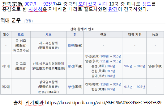 전촉 왕조기간이 18년동안이고 아버지 왕건이 죽자 아들끼리 왕위다툼을 하다가 막내 왕연이 3년 집권하다 살해당한다.
