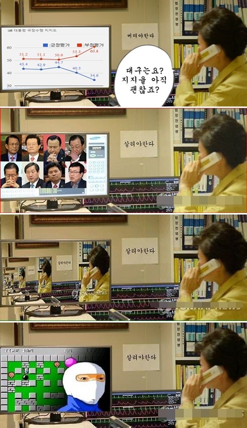 네티즌들은 박 대통령이 바라보는 모니터에 다양한 이미지를 합성하며 ‘살려야 한다’는 문구의 의미를 뒤바꿨다. 메르스 사태 이후 하락세를 보이는 대통령 국정수행 지지도, 김기춘·이완구 등 친박 계열 인사들을 넣고 ‘살려야 한다’고 연출하는 식이다. ‘나부터 살려야 한다’는 문구로 바꾼 네티즌도 눈길을 끌었다.