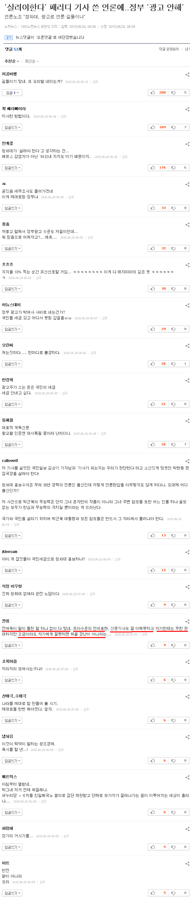이에 전국언론노동조합(언론노조)은 이날 '메르스 보도를 광고로 길들이겠다는 청와대'라는 성명을 발표하고, 청와대를 정면으로 비판했다.