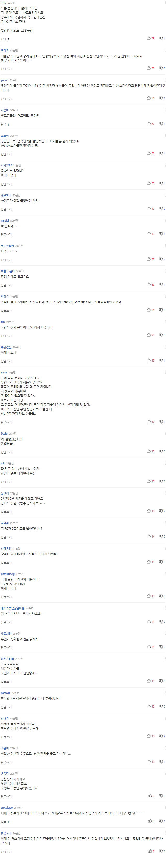 작성자정론직필작성시간17.06.21조회수1,923 목록 댓글 12[속보] 국방부 "인제에서 발견된 무인기, 北 무인기로 판명"