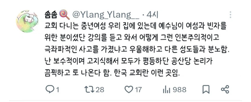 작성자산비탈양 작성시간 26.03.31 실상 예수는 근본적으로 빈자와 고통받는자들 편에 섰던 사회주의자였는데 어떻게 한국의 기독교는 전광훈이같은 자가 설치는 판이 되었는가?