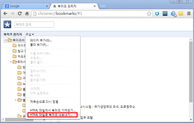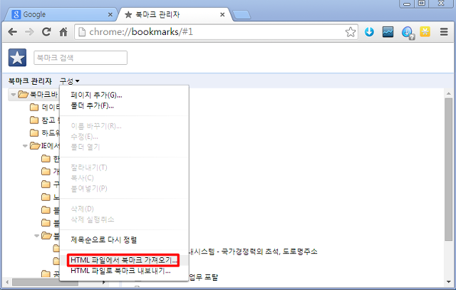 [Chrome 맞춤설정 및 제어] - [북마크] – [북마크 관리자] – [구성]에서 [HTML파일에서 북마크 가져오기]를 통해