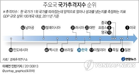 연구소는 GDP 규모 상위 100개국의 2001~2011년 추격 실적을 분석했다. 그 결과 한국의 추격지수는 2011년 현재 100개국 중 26위로 나타났다.