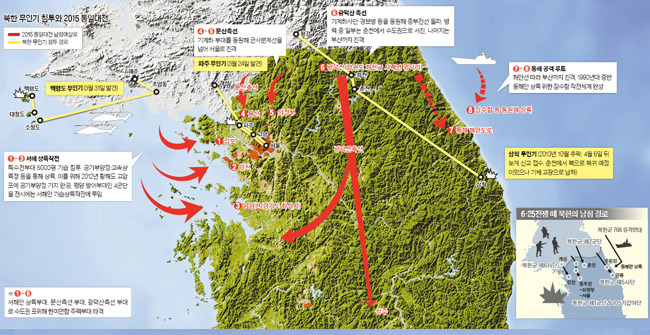 중앙SUNDAY가 입수한 ‘북한 무인기 침투와 2015 통일대전’ 보고서에 따르면 북한의 통일대전은 서해안에 5000명 규모의 특수전 부대의 기습 상륙과 함께 문산·광덕산 축선을 핵심 공격로로 삼는다. 수도권 함락을 위해 세 방향에서 공격하겠다는 것이다.