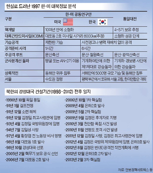 보고서에 따르면 북한군이 최악의 경제난 속에서도 새로운 형태의 전면전을 준비하고 있다는 첩보가 처음 입수된 것은 90년대 중반이다. 당시 한·미 정보 당국은 수많은 북한 주민이 굶어 죽는 상황에도 불구하고 북한군이 전력 구조 및 군 구조 개편과 함께 ▶핵·대륙간탄도미사일(ICBM) 개발 ▶통신 선로 지중화 ▶기습 공격을 위한 대규모 군사력 전진 배치 ▶미군의 첨단 감시장비에 대한 특별대비조치 등이 김정일의 특명으로 비밀리에 진행되고 있다는 첩보를 입수했다. 이에 대응하기 위해 양국은 첩보·정보 교류를 정례화하고 북한군의 쿠데타 가능성, 핵무기·ICBM 개발 동향과 한반도 전쟁 양상의 변화 등에 대한 공동 연구를 진행해 왔다.