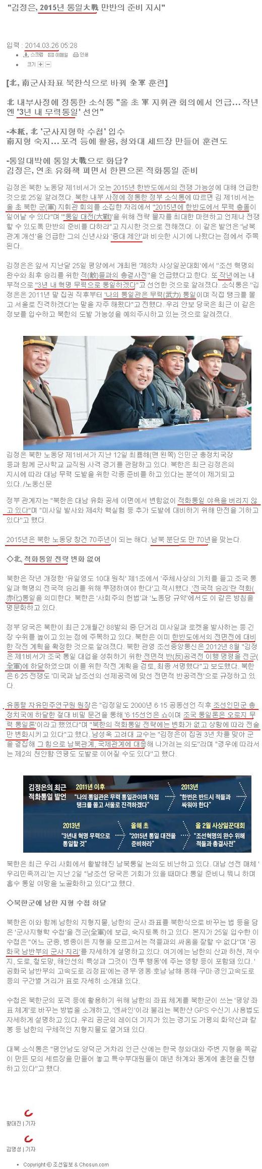 “나의 통일관은 무력통일관이며 작접 탱크를 몰고 서울로 진격하겠다”(2011년), “한번은 반드시 적들과 싸워야 한다” “3년 내 혁명 무력으로 통일할 것”(2013년), “2015년 통일대전을 준비하라” “조선혁명 완수를 위해 적들과 총결사전을 벌이자”(2014년)…. 김정은은 올해 초 군지휘관 회의에서도 “2015년 한반도에서 전쟁이 일어날 수 있다. 통일대전을 위해 전략물자를 최대한 마련하고 언제나 전쟁을 할 수 있도록 준비를 다하라”고 지시를 내린 것으로 알려져 있다.