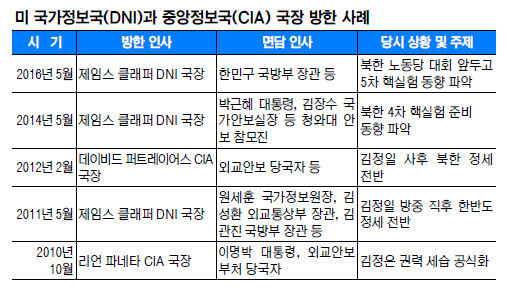 게다가 북한은 미·중의 강한 경고 메시지에도 아랑곳 않고 탄도미사일 시험을 계속하는 등 미국과 ‘강 대 강’ 대결을 불사하겠다는 태도를 보이고 있다. 과거 미국 정보기관 수장들도 한반도 정세의 급변이 예상되는 시기에 한국을 찾았다. 제임스 클래퍼 전 미 국가정보국(DNI) 국장은 북한의 7차 노동당대회 개최 이틀 전인 지난해 5월 4일 극비 방한한 바 있다. 북한 집권당인 노동당이 당대회를 여는 것은 36년 만으로, 당시 북한이 ‘축포’ 차원에서 핵실험을 할 것이라는 관측이 많았다.