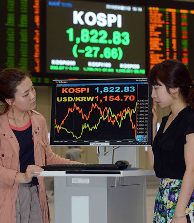 21일 코스피지수가 1,820선까지 하락하자 서울 여의도에 있는 한국거래소 직원들이 심각한 표정으로 주가 그래프를 살펴보고 있다.