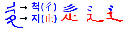 (4) 辵 = 辶 : 갈/착, 뛸/착 <척(彳)+지(止) = 착(辵=辶)>