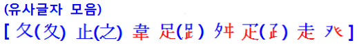 사거리 모양 발모양(걸어간다) 사거리와 발모양을 합침(길을 걸어간다)