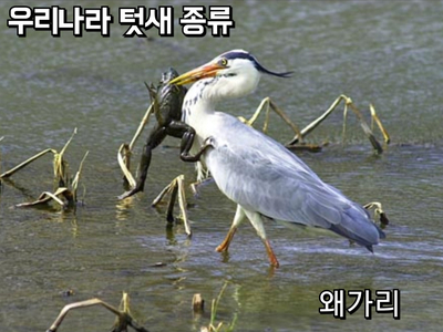 왜가리는 황새목 왜가리과에 속하는 물새의 일종으로 회색 등과 긴 목이 특징으로 단독 내지 소규모 무리 생활을 합니다. 사실상 백로, 해오라기와 함께 대한민국의 하천과 논바닥을 지배하고 있는 조류로서 두루미, 황새, 따오기 등의 친척들이 서식지의 파괴와 환경오염 문제로 인해 국내를 포함하여 전 세계적으로 거의 멸종 위기에 놓인 것과는 달리, 왜가리는 환경 변화에 대한 적응력이 비교적 높아 유일하게 인간과 공존하는데 성공하였습니다.