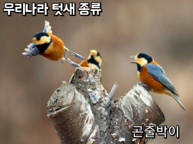 곤줄박이는 참새목 박새과의 한 종으로, 한국에서는 텃새로, 박새처럼 흔히 볼 수 있는 새입니다. 주로 산, 공원 등 숲이 우거진 곳에서 흔히 볼 수 있습니다. 생김새는 머리 위와 아래가 검은색이고, 눈을 지나는 중간이 주황색입니다. 배는 주황색에서 갈색을 띱니다. 먹이는 곤충류를 먹으며, 땅콩 등을 놓아줘도 먹습니다. 산속뿐 아니라 공원, 주택가에 나무가 우거진 곳에서는 흔히 볼 수 있으며 가늘고 높은 소리로 웁니다.