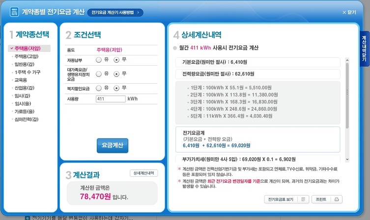 라. 이 분이 궁금한 점은 411kw라는 사용 금액에 대한 전기요금 계산을 주택용 저압으로 했을 때는 78,470원이 맞는데 주택용 고압