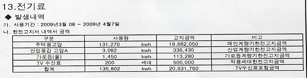 - 아래의 내역서를 상세히 보면 주택용고압, 산업용(갑) 고압A, 가로등으로 전기요금 체계가 나뉘어져 있다.
