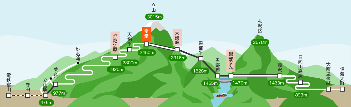 평원과 다테야마연봉 연봉(오야마3,003m) * 산위 까만 부분이 오야마 신사