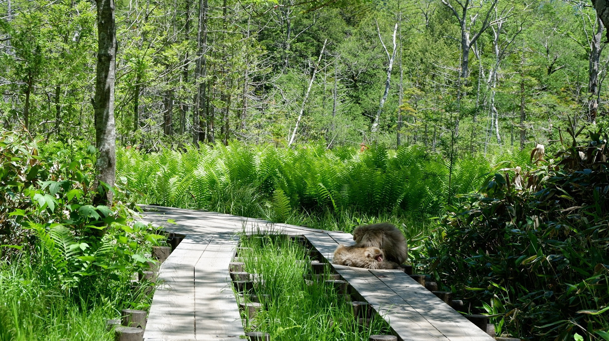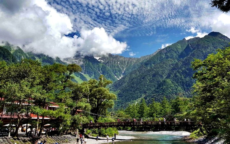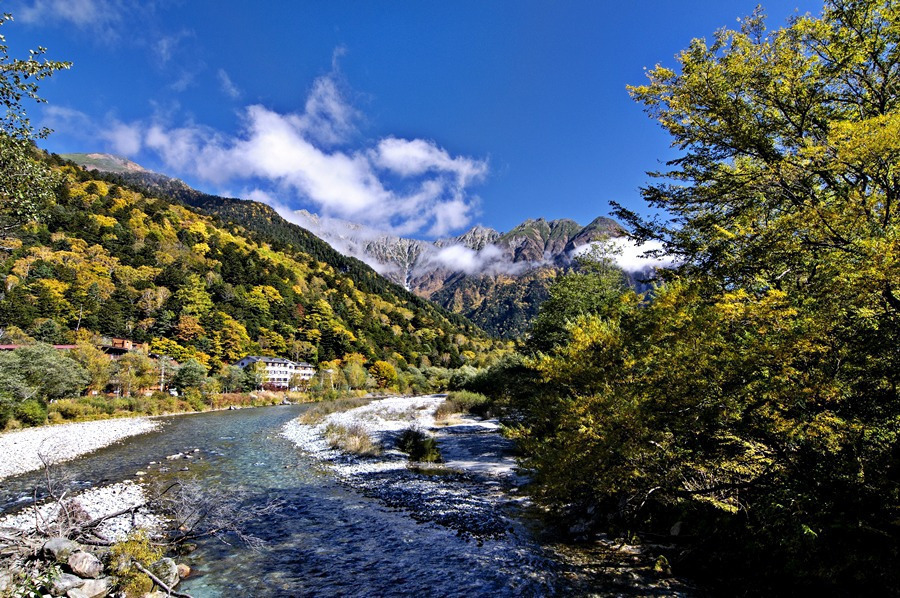 화산활동으로 생긴 20km에 이르는 길은 아즈사가와(梓川)를 따라 때 묻지 않은 원시림과